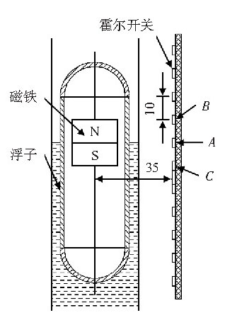 算出磁性浮子的磁場分布,根據測量精確度、霍爾開關的磁場強度閡值、霍爾開關到浮子的距離等己知條件計算出浮子內磁鐵的大小,簡化了工藝流程,減少了工作量。在程序設計時,