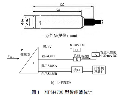 頂裝型磁翻板液位計以微處理器為核心單元,具有檢測、判斷和信息處理功能。其測量水位的基本原理是利用半導體硅材料的壓阻效應,實現液位壓力與電信號的轉換[2]。即把與液體深度成正比的液體靜壓力,通過液位計( 變送器) 轉換成電流信號輸出,從而建立輸出電信號與液體深度的線性對應關系,實現對液位( 水位) 的測量。沉箱水位監測選用MPM4700 型頂裝型磁翻板液位計,該液位計以擴散硅壓阻式傳感器為管芯,集成變換器電路、微處理芯片為一體,其性能穩定,結構緊湊,外圍線路簡單。該液位計為四線制,可同時輸出一組4 ~ 20 mA 的標準電流信號和RS486 數字信號。MPM4700 型智能