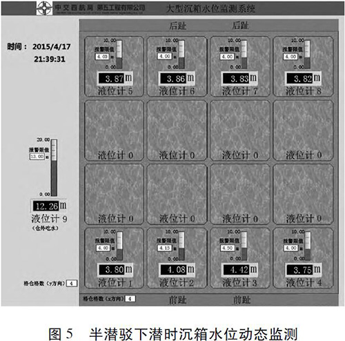 漳州后石港區3 號泊位碼頭工程采用重力式沉箱結構,該工程沉箱共15 件,單件質量4 365 t,沉箱長、寬、高分別為19. 8、21. 9 、25. 0 m; 沉箱分7 層澆筑,澆筑*頂層時3# 格倉按設計圖紙預留3 m 高的缺口。在漳州預制廠預制,沉箱安裝施工現場距離預制廠約6. 3 km。沉箱采用氣囊橫移至出運通道,再縱移至出運碼頭前沿線上駁,采用8 000 t 半潛駁下潛安裝。根據浮游穩定計算,沉箱各格倉壓載水見圖4。2#、6# 格倉為3. 98 m,3#、7#格倉為4. 34 m,其余格倉為3. 80 m,沉箱倉外吃水12. 15 m。根據當地水文站潮汐表,2015-04-17T20∶30 下潛坑潮位條件符合下潛要求,半潛駁在下潛區開始加水下潛; 下潛至沉箱吃水1. 8 m 時,同時開啟沉箱的8 個注水閥門開始向沉箱格倉中注入壓載水; 當沉箱吃水5 m 時半潛駁暫停下潛,起重船靠近半潛駁,工人將連接起重船吊鉤的鋼絲繩用卡環固定在沉箱頂部吊環上。半潛駁繼續下潛至9 m 時再暫停下潛,等待吊纜就位。半潛駁繼續下潛,在沉箱底與枕木支墊處于脫離的臨界狀態時,減緩半潛駁下潛速度,直至沉箱完全脫離浮船塢。此時啟動吊機,使鋼絲繩處于輕微受力狀態。在半潛駁下潛及沉箱格倉注入壓載水過程中,通過大型沉箱水位監測系統能夠動態顯示各格倉水位值及沉箱的吃水深度( 圖5)