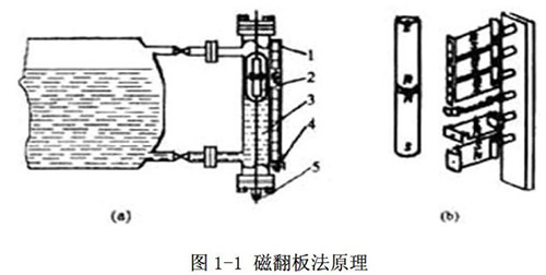 磁翻板液位計帶遠傳原理如圖1—1a所示,1-翻板指示組件;2-浮子;3-連通管組件;4-調整螺釘;5-放泄塞。浮子裝有一組永久磁鐵,隨液位變化而上下移動,通過磁耦合作用帶動磁翻板組件翻轉。當液位上升時,磁翻板的紅色面朝外;液位下降時,白色面朝外。故根據磁翻板的顏色即可確定液位。浮子內磁鐵與磁翻板磁性結構如圖1—1b所示,每片翻板間的距離一般為10 mm。采用幾臺磁翻板裝置串聯可增大量程。