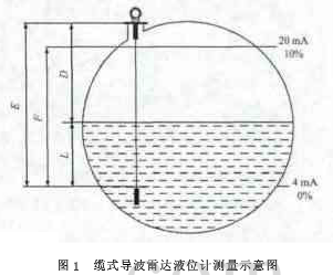 以LD51為例,該液位計是基于TOR(行程時間)原理的“俯視式”測量系統。對參考點至液氨表面間的距離進行測量。高頻脈沖信號被發射至探頭,并沿探頭傳播。脈沖信號在液氨表面發生反射,反射信號被儀表接收,并被轉換成物位信息。此測量方法即為TOR法(時域反射法),其測量參考點至液氨表面間距離(D)與脈沖信號的運行時間(t)成比例關系:D=C·t/2,其中,C為光速。如圖1所示。空標高度(E)已知時,液位(L)的計算公式如下:L=E-D。