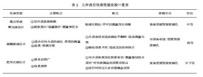 通過以上案例分析,幾種液位檢測儀表在液氨儲罐上的應用各有不同的使用效果,現將其性能指標歸納如下,供設計選型及儀表維護人員參考。