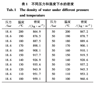 在實(shí)際過(guò)程中,加熱器中不同位置的水溫是不一致的,它和加熱器的形狀、體積等條件有關(guān),同理在測(cè)量通道中不同位置的水溫也是不一致的。這會(huì)對(duì)理論計(jì)算造成較大的困難,在此對(duì)容器中水的溫度分布做了簡(jiǎn)化。如圖1所示,在閥門V的左端為加熱器的水溫,假設(shè)水溫一致,且都為T1,在閥門V的右端為測(cè)量通道的水溫,設(shè)水溫一致,且都為T2。在加熱器額定工作壓力P的情形下,T1溫度和T2溫度下對(duì)應(yīng)的水的密度分別為ρ1和ρ2。在閥門V處,左端的壓力等于右端的壓力,由此可得: