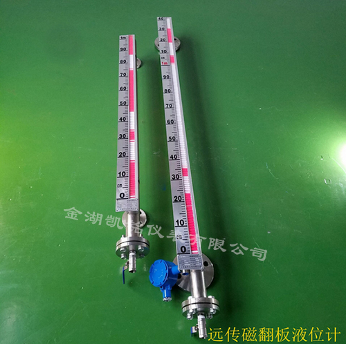 磁翻板液位計(也可稱為磁性浮子液位計)根據浮力原理和磁性耦合作用研制而成。當被測容器中的液位升降時,液位計本體管中的磁性浮子也隨之升降,浮子內的永久磁鋼通過磁耦合傳遞到磁翻柱指示器,驅動紅、白翻柱翻轉180°,當液位上升時翻柱由白色轉變為紅色,當液位下降時翻柱由紅色轉變為白色,指示器的紅白交界處為容器內部液位的實際高度,從而實現液位清晰的指示。