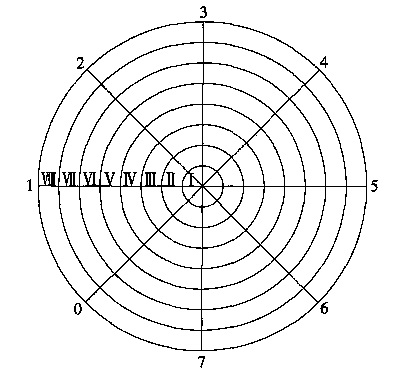 1.2.2 幾何測(cè)量法根據(jù)立式金屬罐容量試行檢定規(guī)程,把圓錐體底圓分成M 個(gè)同心圓,根據(jù)所分圓環(huán)面積相等條件決定半徑。圓錐體分為一個(gè)小圓錐和多個(gè)圓臺(tái)。在每個(gè)圓心圓周測(cè)N 個(gè)點(diǎn),即測(cè)N 個(gè)點(diǎn)到罐底中心的高度。底量測(cè)量原理見(jiàn)圖2。