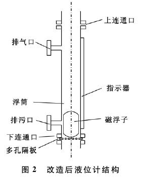 (3)方案3。改造現(xiàn)有的液位計(jì),采用上下端日連接,上過程進(jìn)日改為排氣口,下過程進(jìn)日改為排污口,原安裝浮子法鑄和排氣閥接日改為連通日,在下部增加一個(gè)多孔隔板,保證浮子不進(jìn)人工藝管線,同時(shí)保證液體的正常流動(dòng)。在保證不改變液位計(jì)結(jié)構(gòu)情況下,將液位計(jì)與工藝管線連接。此方案優(yōu)點(diǎn)是花費(fèi)少,不閑置設(shè)備,并且還能達(dá)到液位計(jì)與管線清理同步,實(shí)現(xiàn)維修與檢修同步。