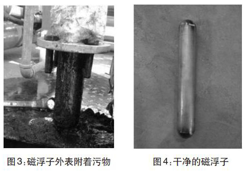 經(jīng)過兩年多運(yùn)行,污水罐內(nèi)可能沉淀污泥雜質(zhì)導(dǎo)致液位計(jì)示數(shù)不準(zhǔn)?,F(xiàn)場(chǎng)拆卸液位計(jì),并且對(duì)浮球和磁浮子進(jìn)行清洗。(圖3-圖4)