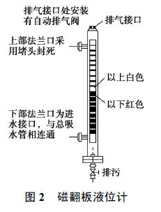 它結(jié)構(gòu)是利用旁通管的原理, 主導(dǎo)管內(nèi)的液位和尾水管內(nèi)的液位高度一致, 根據(jù)阿基米德定理, 磁性浮子在液體中產(chǎn)生的浮力和重力平衡, 當(dāng)尾水管中的水位升降時(shí), 液位計(jì)主導(dǎo)管內(nèi)的浮子也隨之升降, 浮子內(nèi)的永久磁鐵通過磁耦合驅(qū)動(dòng)指示器內(nèi)的翻板指示器, 當(dāng)液位上升或下降時(shí), 翻板指示器由白色翻轉(zhuǎn)為紅色, 或由原來的紅色翻轉(zhuǎn)為白色, 指示器的顏色改變的高度就是被測水位的實(shí)際高度, 從而實(shí)現(xiàn)液位的現(xiàn)場指示, 以供運(yùn)行人員目測尾水管的實(shí)時(shí)水位。安裝于液位計(jì)管壁外側(cè)的磁記憶開關(guān),可多點(diǎn)設(shè)置、滑動(dòng)調(diào)整位置, 提供了液位開關(guān)量報(bào)警功能。在裝置的頂部安裝了一個(gè)自動(dòng)排氣裝置, 當(dāng)主導(dǎo)管內(nèi)液位上升時(shí)能夠自動(dòng)的排氣, 下降時(shí)能夠按時(shí)補(bǔ)氣。