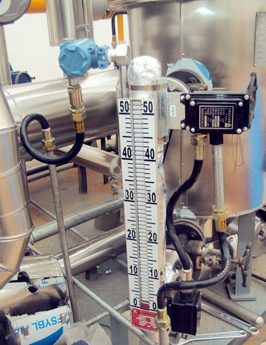 鑒于潤滑油液位計(jì)具有被測(cè)介質(zhì)與指示機(jī)構(gòu)完全隔離,密封性能好,防泄漏、適應(yīng)腐蝕條件下的液位測(cè)量等優(yōu)點(diǎn),且可靠性高、耐振性能好、結(jié)構(gòu)簡(jiǎn)單、安裝方便、維護(hù)費(fèi)用低,現(xiàn)已在電力、石油、化工、冶金、環(huán)保、船舶、建筑、食品等行業(yè)得到廣泛應(yīng)用。本公司用戶上海某公司帶熱壓縮器低溫多效蒸餾海水淡化的濃鹽水、蒸餾水及冷凝水液位測(cè)量都采用帶遠(yuǎn)傳的潤滑油液位計(jì)。為了防止結(jié)垢,需在低溫的情況下讓海水達(dá)到沸點(diǎn),要求海水淡化裝置內(nèi)部處于負(fù)壓狀態(tài),正常運(yùn)行時(shí)為-0.093MPa左右,此為用戶潤滑油液位計(jì)使用須達(dá)到的工藝要求,以下說明即為儀表在負(fù)壓狀態(tài)下發(fā)生管路漏氣的典型故障分析情況。