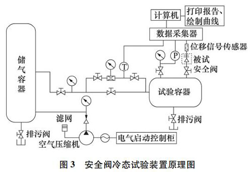 安全閥冷態試驗裝置( 見圖 3) 主要由壓縮氣源、儲氣罐、節流控制閥、試驗罐、閥門和管道、數據采集系統、控制系統等組成,可對公稱壓力 PN≤20 MPa,公稱通徑 DN≤150 mm 的安全閥進行整定壓力試驗、排放壓力試驗、回座壓力試驗、開啟高度試驗、排量及排量系數試驗,檢測參數和自動化程度達到國內**水平。