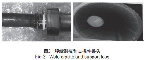 在歷次大修執(zhí)行 GSS 系統(tǒng) MSR 熱水箱液位計(jì)預(yù)防性維修檢查時(shí)發(fā)現(xiàn),部分導(dǎo)波桿支撐件破碎并丟失,同時(shí)存在探桿根部焊縫有裂痕的問題,見圖 3 焊縫裂痕和支撐件丟失。
