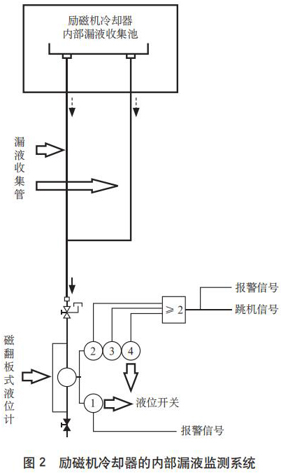針對該核電廠所采用的 TKJ167-45 型無刷側裝式磁翻板液位計外部管道監測裝置存在問題及對內部管道泄漏無法監測的問題,對側裝式磁翻板液位計的漏液監測系統進行技術改進。改進后的系統包括內部漏液監測和外部漏液監測兩部分,二者相互獨立。當監測到冷卻器內部管道泄漏時,能夠及時觸發報警和跳機信號,避免勵磁機燒毀;當監測到冷卻器外部管道泄漏時,僅觸發報警信號,提醒運行和維修人員及時處理故障,從而保證發電機組的正常運行。