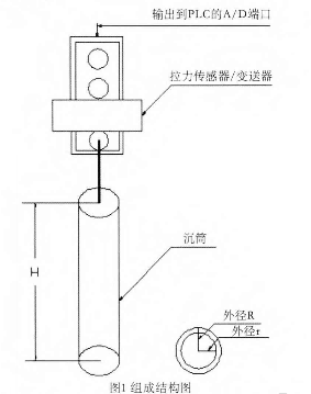 沉筒式液位計主要由拉力傳感器、變送器及沉筒組成,拉力傳感器內部貼有電阻應變片,通過信號線將變送器輸出的標準電流信號送到PLC的A/D輸入端口,用以進行數據處理和遠程控制。沉筒由上下兩端封閉的空心材料制成,并懸掛在拉力傳感器的受力端,其余部分投入到儲料罐中,拉力傳感器用法蘭盤或自帶螺紋固定在儲料罐的上方,結構如圖1所示。